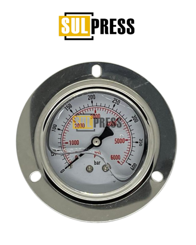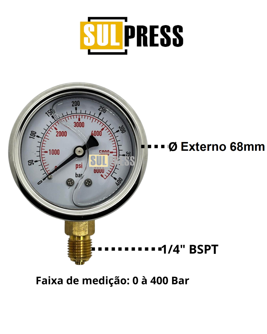 – Faixa de medição de 0 à 400 Bar (0 a 6000 psi), conexão inferior ¼ BSPT, visor com glicerina, diâmetro de 68mm