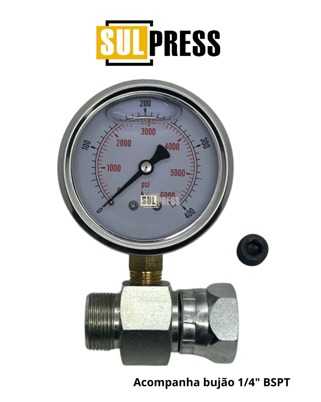 – Rosca fêmea no corpo sextavado: 1/4″ BSPT (para manômetro, tomador de pressão ou fio capilar)
