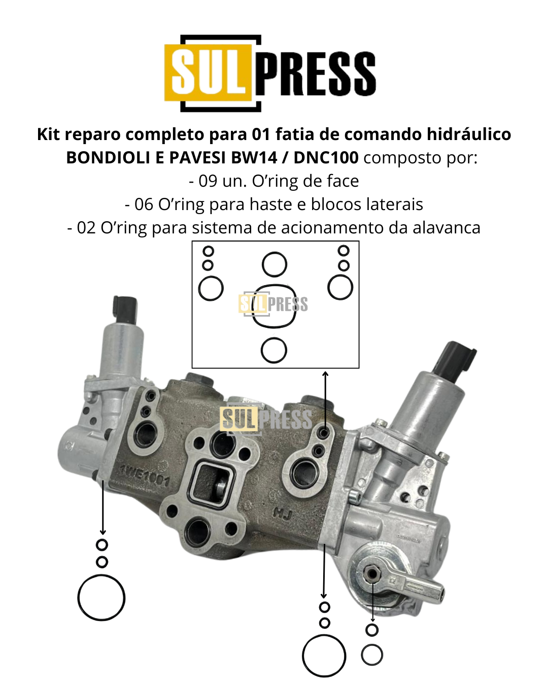 Kit de reparo completo com vedações para 01 fatia do comando hidráulico BONDIOLI E PAVESI modelo BW14 / DNC100 contendo componentes genuínos e de alta qualidade para garantir o perfeito funcionamento do sistema e manutenção.