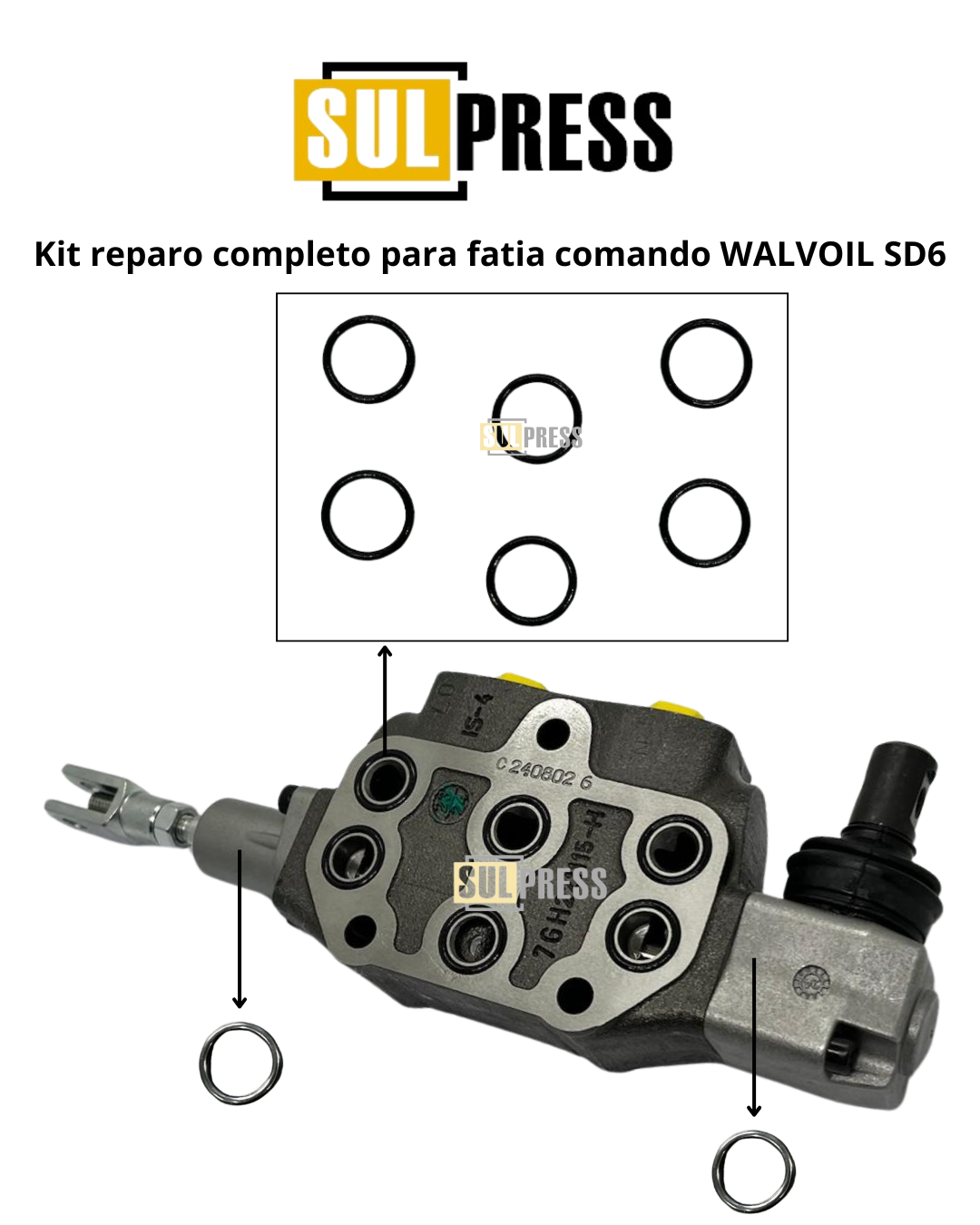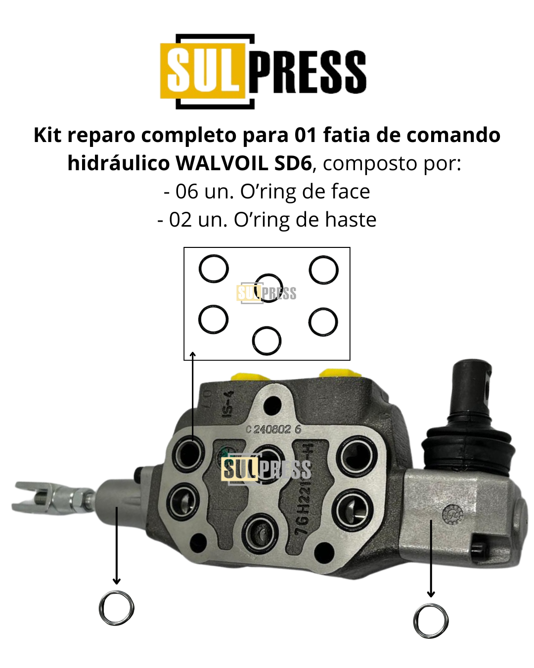 Kit de reparo completo com vedações para 01 fatia do comando hidráulico WALVOIL modelo SD6, contendo componentes genuínos e de alta qualidade para garantir o perfeito funcionamento do sistema e manutenção.