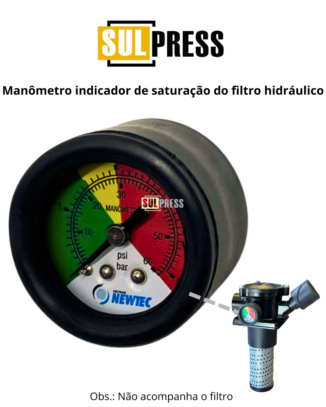 Manômetro indicador de saturação do filtro de retorno / momento de troca de elemento filtrante, marca NEWTEC.