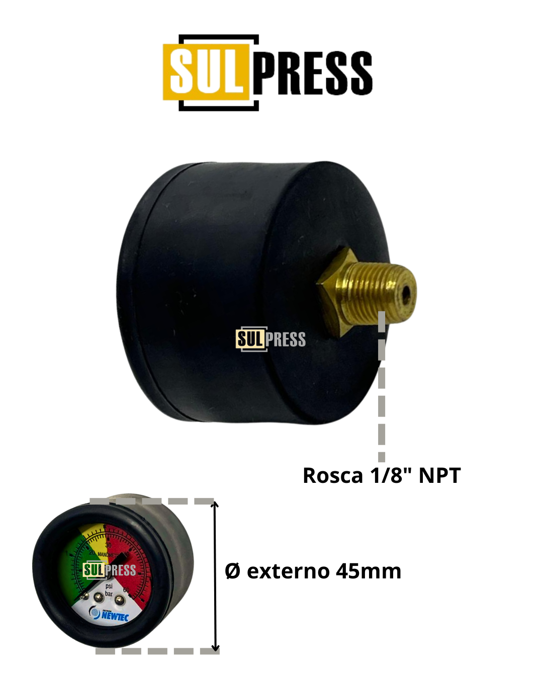 Este é o manômetro que fica acoplado nos filtros de retorno NEWTEC linha HRR09A / HRR16A / HRR18A, e demais filtros que possuem conexão 1/8” NPT para manômetro.