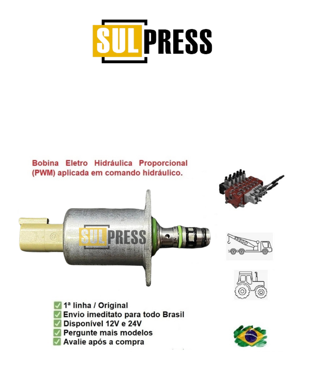Bobina eletro-hidráulica proporcional (PWM), ideal para aplicação em comandos hidráulicos de guindastes, gruas, tratores, equipamentos da linha agrícola e mobil em geral.